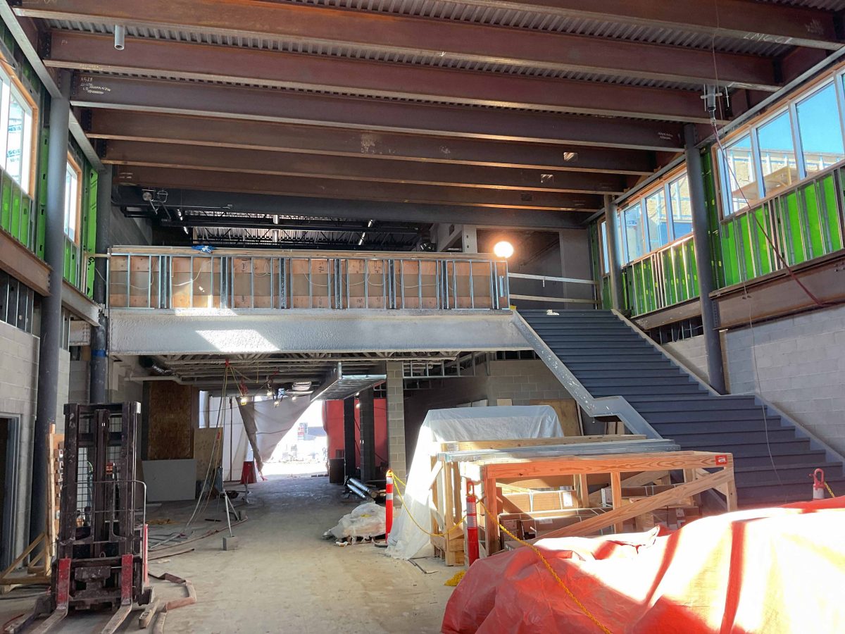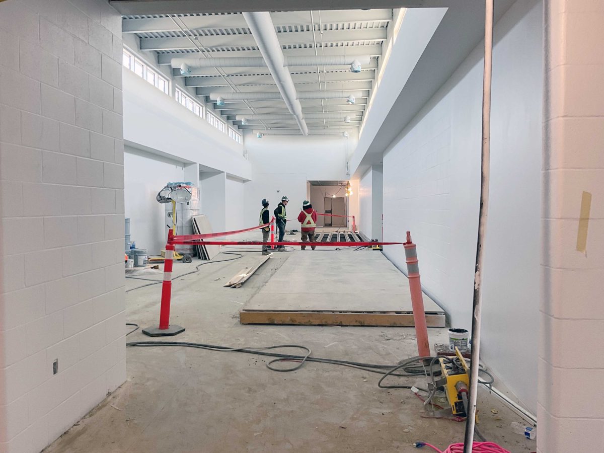Crews have also been installing cladding and insulation on the upper floors, pouring the concrete floor in the change room area, and working on the construction of the building elevator. They are also installing light poles and car plug-ins in the staff parking area.