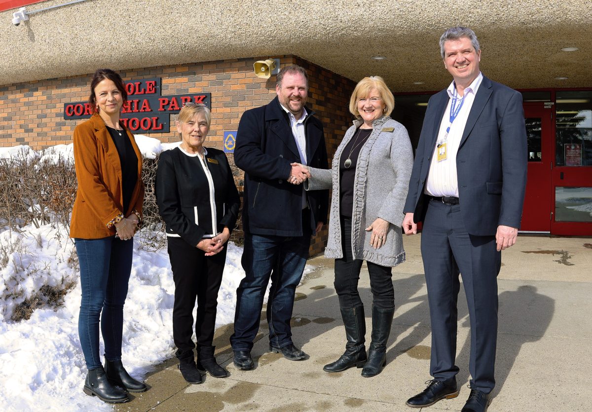 MLA Brandon Lunty (third from left) shakes hands with Board Chair Esther Eckert. Ward 3 Trustee Barb Martinson, Superintendent of Schools Michael Borgfjord (right), and ÉCPS Principal Rachel Djordjevic (left) joined the two on March 7 for the modernization announcement.