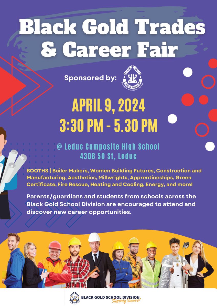 We are pleased to present a second Trades and Career Fair for high school students at Leduc Composite High School (4308 50 St, Leduc) on April 9, 2024. Interested parents and students from all Black Gold schools are encouraged to attend from 3:30pm – 5:30pm.