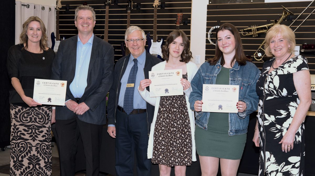 (L-R) Vice Chair Angie Charpentier, Superintendent Michael Borgfjord, Trustee Gary Hansen, student artists Sofia Bariak and Julie Dakin, and Board Chair Esther Eckert.
